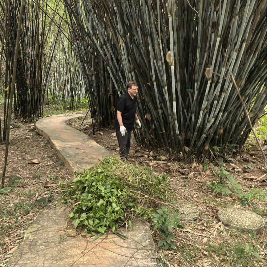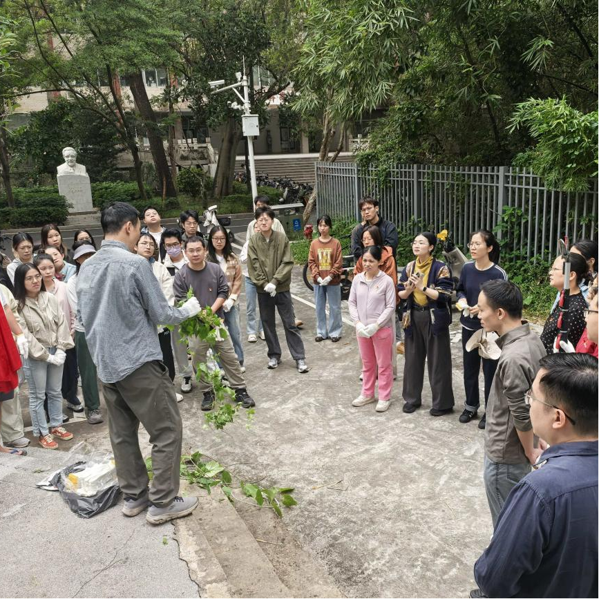 随后,周仁超教授围绕竹园生态系统的特点,为参与师生进行了细致的现场讲解。他系统介绍了竹园中常见的有害植物种类、识别方法及其对生态环境的影响,并详细演示了科学清理的技巧与注意事项。周教授特别提醒师生在活动中注意个人防护,穿长袖长裤,佩戴手套,做好防蚊虫等防护措施,确保活动安全、有效开展。