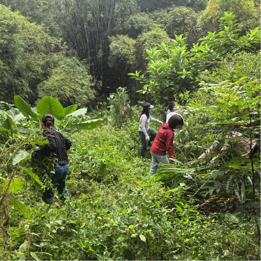 活动期间,全体教师党员和研究生党员代表分为多个小组,分区域开展清理工作。大家分工协作,配合默契,有的负责拔除地面上的微甘菊,有的负责清理侵袭低处蕨类的五爪金龙,有的负责消灭高处盘缠的松筋藤。