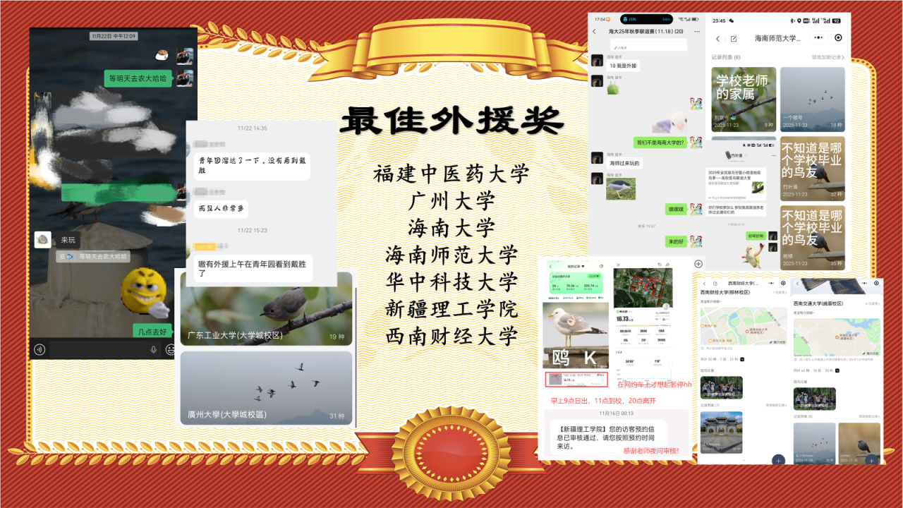 全国高校社团观鸟联谊赛,重在“联谊”,鼓励不同地区、不同学校的观鸟爱好者互相了解、互相交流。在本次鸟赛中,福建中医药大学、广州大学、海南大学、海南师范大学、华中科技大学、新疆理工学院、西南财经大学等高校的鸟友们纷纷拉起了外援大队,互相串门,真正实现了“你们队就是我们队”的美好愿景,让我们把“最佳外援奖”颁给以上队伍!