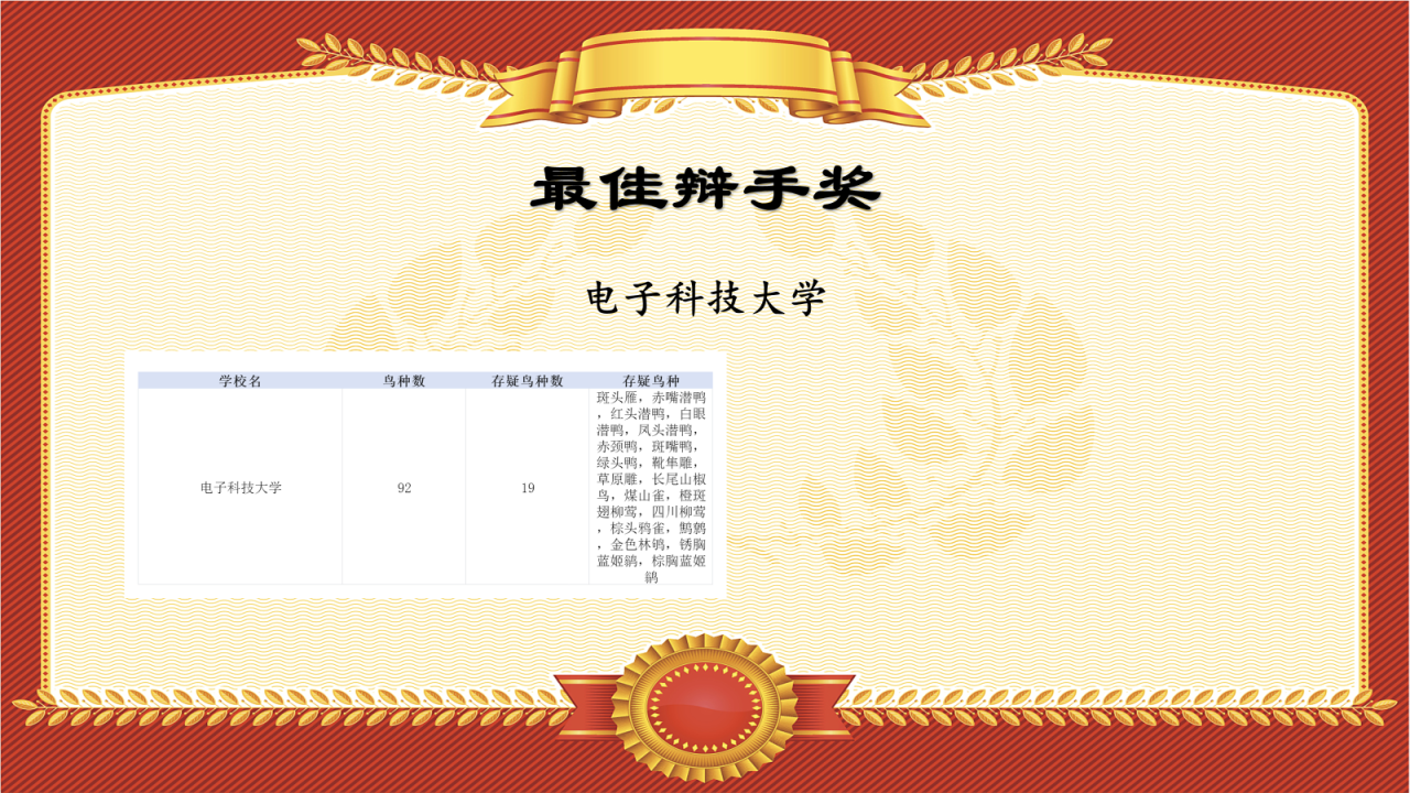 电子科技大学是本届鸟赛新加入的队伍,他们在清水河校区记录到了92种鸟类,包括8种雁形目,草原雕、靴隼雕等高光猛禽以及多种西南特色林鸟,因其惊人的鸟种数量和质量被审核组标红了19种存疑鸟种,最终通过了18种,故而授予“最佳辩手奖”。