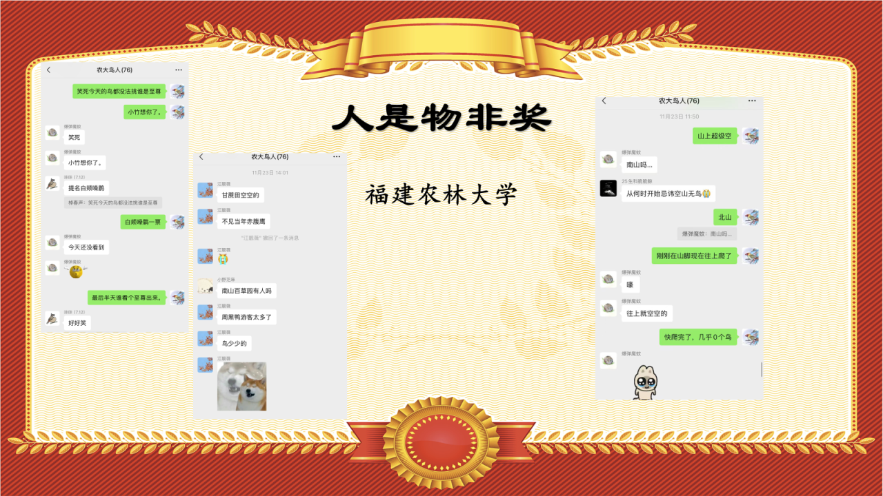 这个奖项致敬各位鸟赛卷王,他们有的从0点一过便开始夜观,有的凌晨五六点便起床观鸟,有的临近半夜还奋斗在夜观一线,令人钦佩。让我们祝贺安徽大学、华中科技大学、西北工业大学的朋友们获得“起早贪黑奖”!