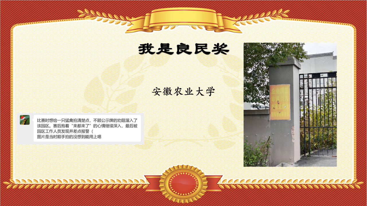 安徽农业大学的同学在观鸟时不慎进入一处企业园区,而后被工作人员发现并差点报警,颁发“我是良民奖”以纪念。