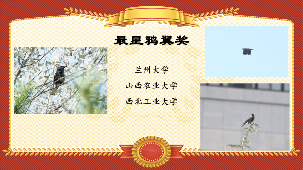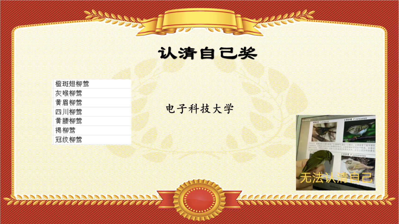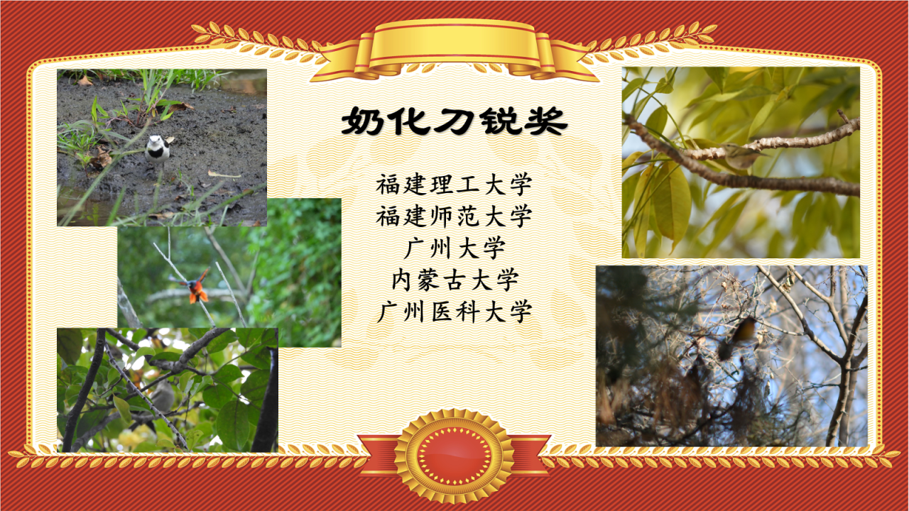 在参赛的所有高校中,电子科技大学以一个校区92种(审核后91种)的记录,夺得所有队伍中单校区最高鸟种纪录,故授予“一个校区也能看奖”!