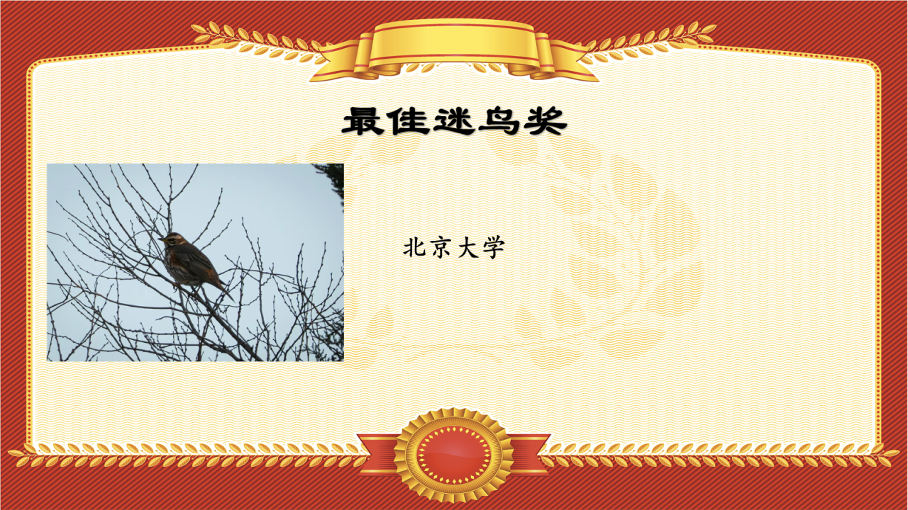 由于鸟赛举办的时间通常在春秋迁后期,部分学校在春秋季鸟赛的成绩差距较大,例如北京大学和山东大学,在上届(春季)鸟赛中分别获得74种、66种的记录,而本届鸟赛只有46种和32种,锐减了将近一半的鸟种,故颁发“南北旅多奖”以纪念。