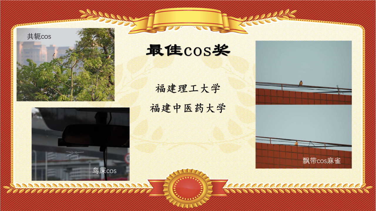 本次鸟赛的“最佳cos奖”颁发给那些厉害的“coser”们——包括生物和非生物。福建理工大学的同学们拍到了在枝头互相cos的棕背伯劳和黑喉石䳭,以及车玻璃上cos裂缝的鸟屎;而福建中医药大学的同学们拍到了房顶栏杆上cos麻雀的飘带,远远望去着实难分,这“最佳cos奖”当之无愧~