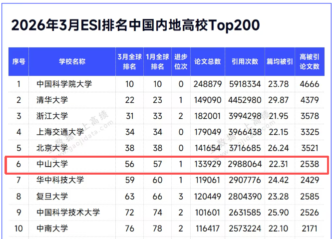 近日,科睿唯安(Clarivate Analytics)公布了2026年3月的ESI最新数据(数据覆盖时间范围为2015年1月到2025年12月)。
