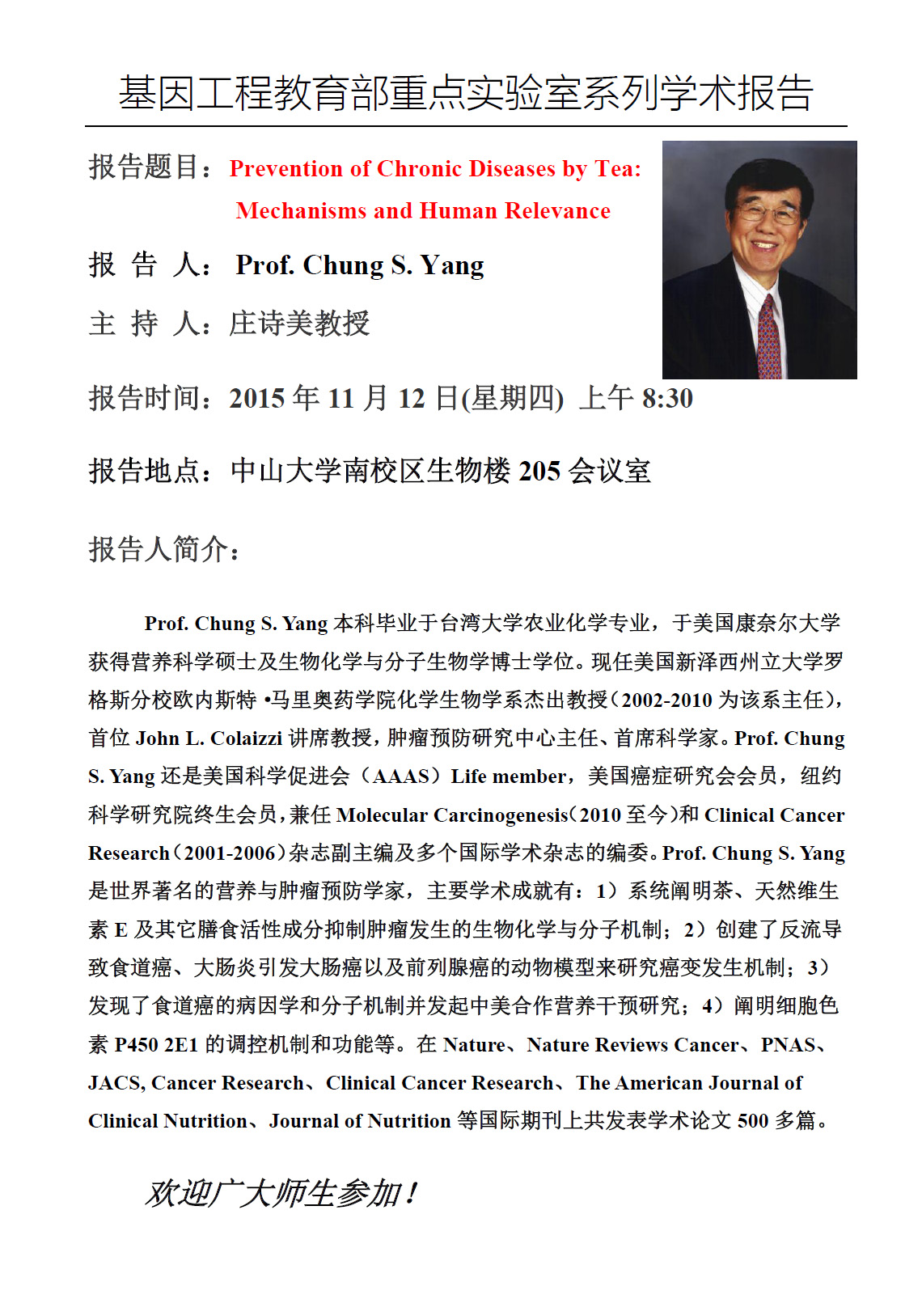 欢迎参加11月12日基因工程教育部重点实验室学术报告