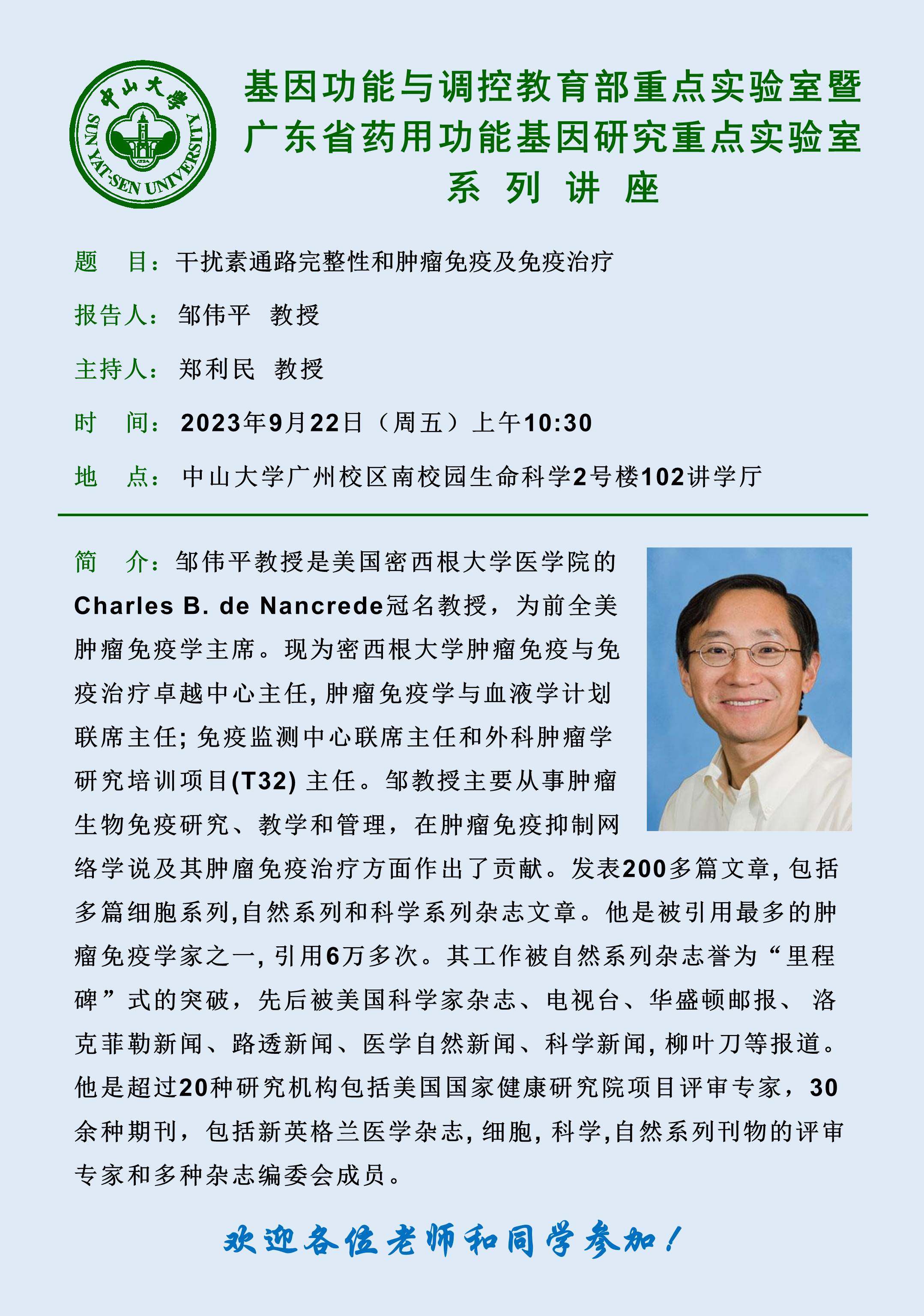 请大家积极参加2023年9月22日上午10点30分在麻豆传媒 大学南校区生命科学2号楼102讲学厅举行的邹伟平教授的讲座!