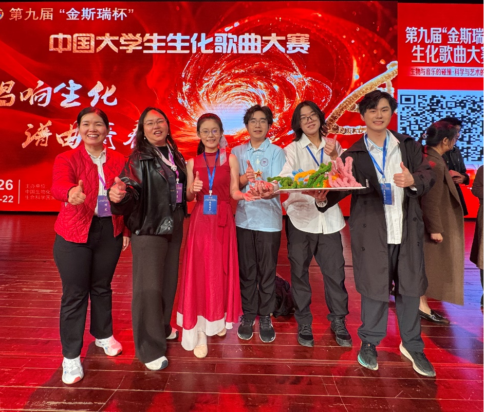 时间过得好快,即使比赛早已落下帷幕已久,但仿佛那段筹备决赛的日子仍在昨天。不断优化的曲调混音和MV画面、复杂的舞台设计和跑动、舞台效果的整体表现、服化道的制备和挑选,一度让未经历过这些的我们无所适从,但还好我们有着老师们的一路陪伴和支持。徐红老师借着她丰富的舞台经验,给我们提出了很多专业性的意见;刘艺菁老师在舞蹈动作上,反复的为我们打磨细节;来自学院的大力支持,以及生物化学教研组团队老师的陪伴与鼓励,是这些全力的托举才让我们能无后顾之忧的全身心投入,能够以轻松的心态应对挑战,最后在西安取得了圆满的结果。感谢老师们的一路陪伴让我们受益匪浅,这是影响终身的收获。